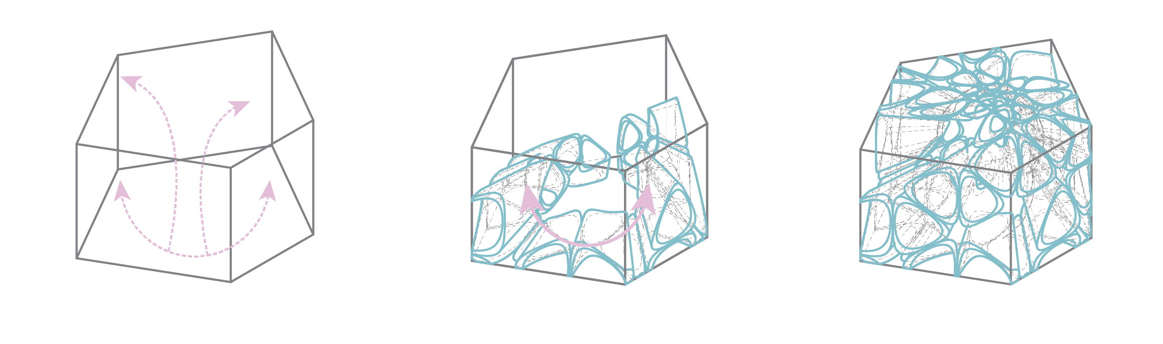 Varying densities and angles of linear cladding along the modules also blur the boundaries between modules and creates moiré effects. These disorientating measures ultimately force the viewer to explore and peer into the model in order to spatially place where the artifacts are located. In effect the chamber becomes a kaleidoscopic viewing machine, allowing the viewer to again experience a playful curiosity similar to a child looking through a toy kaleidoscope for the first time.