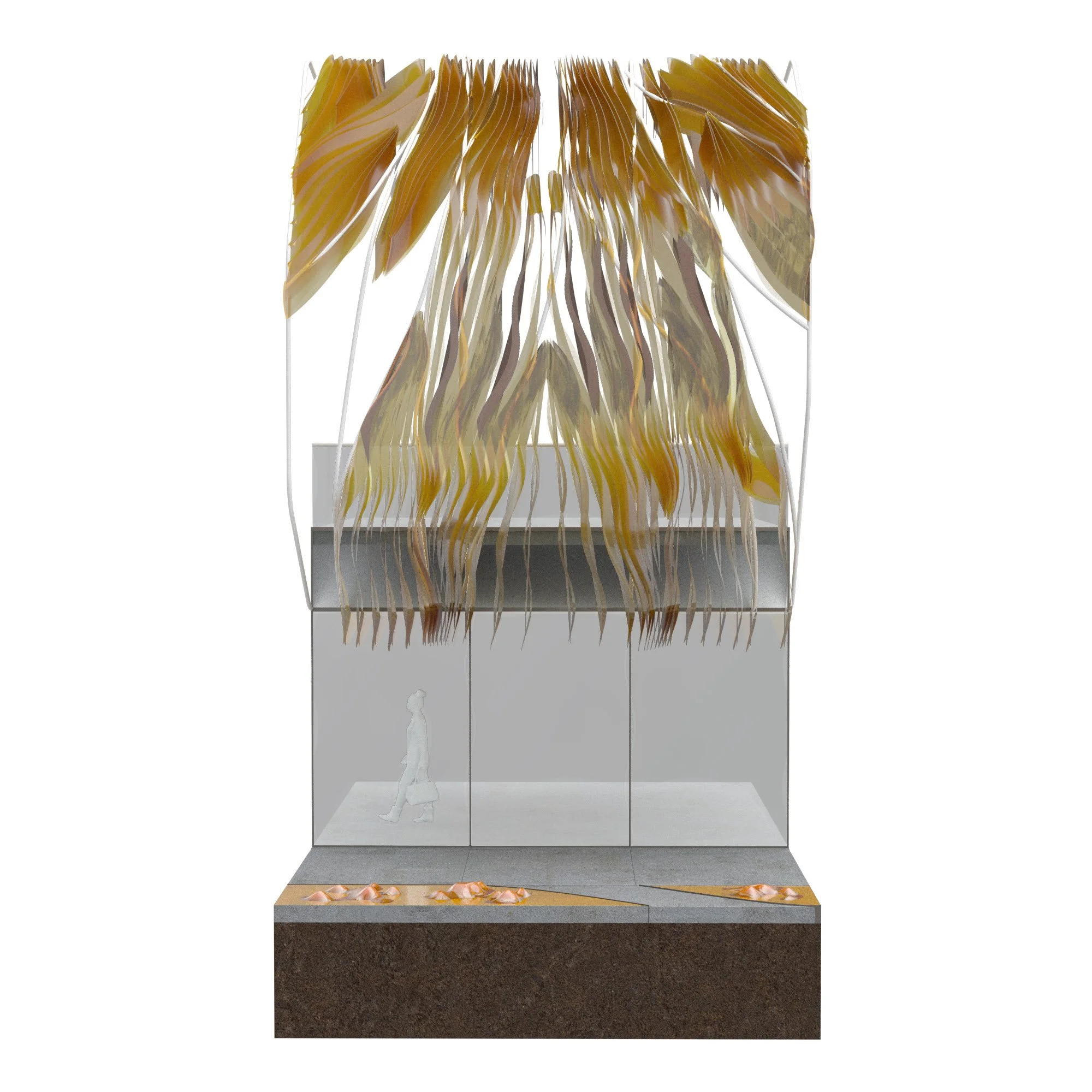 This garment also tests ideas of combining a bio-mateial, chitosan (in yellow) which is extracted from shrimp shells. This experience was fruitful because it allowed our team te leverage our experience of architectural design while learning ways to complement it with scientific studies of materials as well as understanding the anatomy of the human body in order to be able to design for it.